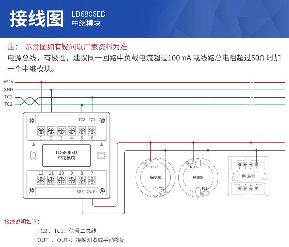 3、建議同一回路中負載電流超過100mA或線路總電阻超過50Ω時加一個中繼模塊。