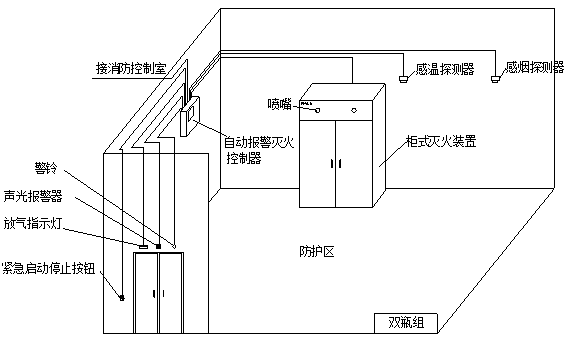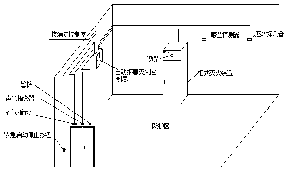 當(dāng)兩種探測(cè)器發(fā)出火災(zāi)信號(hào)時(shí),控制主機(jī)啟動(dòng)警鈴和聲光報(bào)警器,聯(lián)動(dòng)關(guān)閉防護(hù)區(qū)開口,進(jìn)入滅火啟動(dòng)延時(shí),達(dá)到設(shè)定的延時(shí)時(shí)間后,自動(dòng)啟動(dòng)滅火裝置。