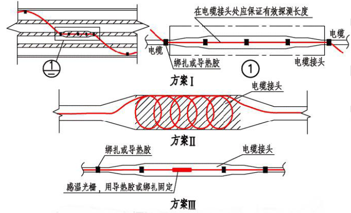 線型感溫火災(zāi)探測(cè)器應(yīng)采用接觸式的敷設(shè)方式對(duì)隧道內(nèi)的所有的動(dòng)力電纜進(jìn)行探測(cè);分布式線型光纖感溫火災(zāi)探測(cè)器在電纜接頭、端子等發(fā)熱部位敷設(shè)時(shí),其感溫光纜的延展長(zhǎng)度不應(yīng)少于探測(cè)單元長(zhǎng)度的1.5 倍,在電纜接頭處應(yīng)采用方案Ⅱ的方式;光纖光柵線型感溫火災(zāi)探測(cè)器在電纜接頭、端子等發(fā)熱部位應(yīng)設(shè)置感溫光柵單元,應(yīng)才用方案Ⅰ、Ⅲ的方式。如圖6 所示: