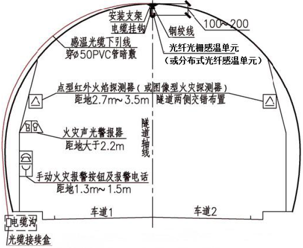 分布式光纖線型感溫火災(zāi)探測(cè)器(或光纖光柵線型感溫火災(zāi)探測(cè)器)應(yīng)設(shè)置在車道頂部距頂棚100mm~200mm,光纖光柵線型感溫火災(zāi)探測(cè)器的光柵間距不應(yīng)大于10m;每根分布式光纖線型感溫火災(zāi)探測(cè)器和光纖光柵線型感溫火災(zāi)探測(cè)器保護(hù)車道的數(shù)量不應(yīng)超過(guò)2 條;探測(cè)范圍要求整個(gè)隧道全部覆蓋無(wú)探測(cè)盲區(qū)。
