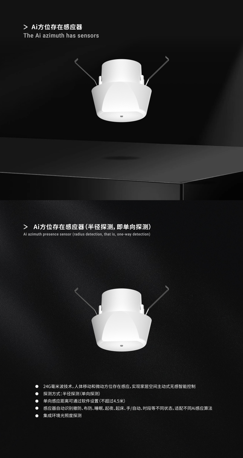 - AI算法自適應(yīng):感應(yīng)器自動識別撤防、布防、睡眠、起夜、起床、手/自動、時段等不同狀態(tài),適配不同Ai感應(yīng)算法