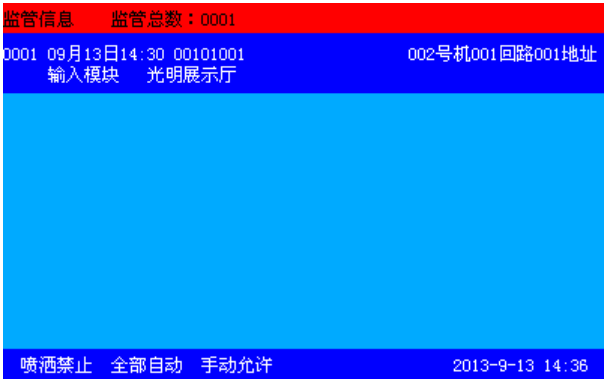 本控制器可在總線上連接輸入模塊,可通過總線部件設置成監(jiān)管模式。當發(fā)生監(jiān)管報警后控制器將進入監(jiān)管報警信息顯示(如圖3-5所示),同時監(jiān)管指示燈常亮。