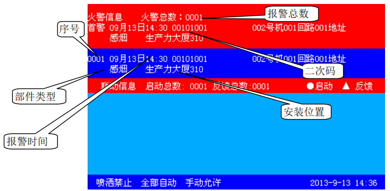 當系統(tǒng)配接的探測器、手動報警按鈕等報警部件確認發(fā)現(xiàn)火情時,通過總線將報警信息傳給火災報警控制器。