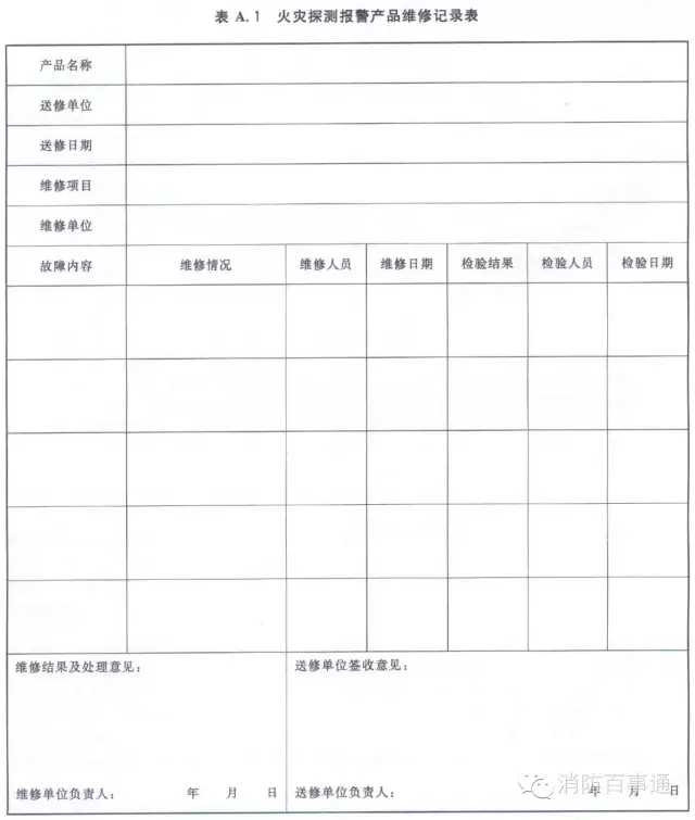 3.1.6承擔(dān)維修的企業(yè)應(yīng)做好維修記錄,與產(chǎn)品使用或管理單位各執(zhí)一份,并保存至該產(chǎn)品報廢?;馂?zāi)探測報警產(chǎn)品維修記錄表的格式參見附錄A。