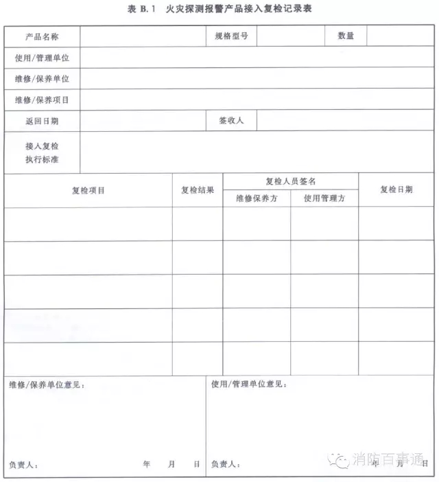 火災(zāi)探測報警產(chǎn)品接入復(fù)檢記錄表的格式見表B.1。